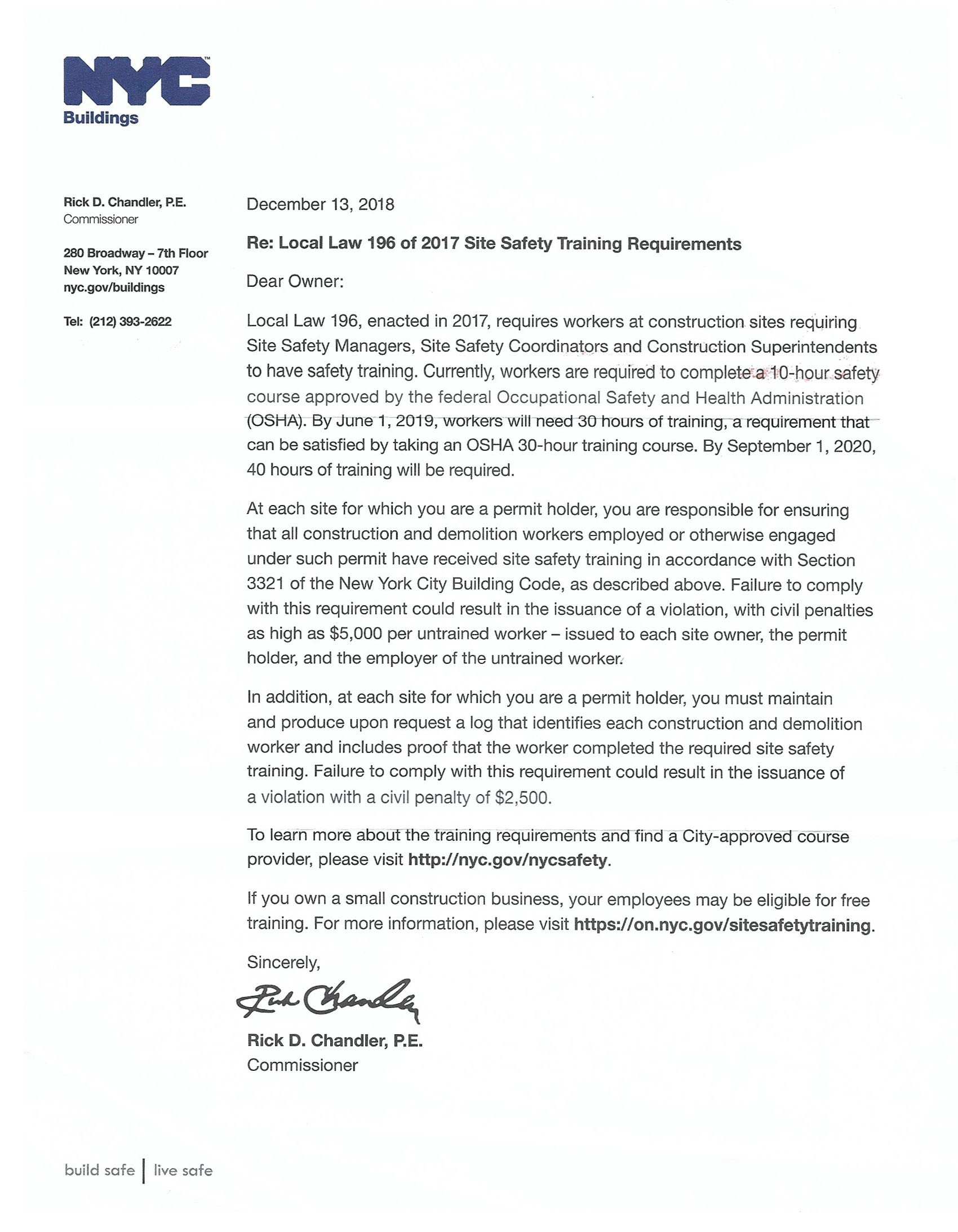 To note, LL196 has put in place a gradual compliance plan for the site safety training. It is phased-in in three parts beginning on March 1, 2018 and with full training being required before September 1, 2020.